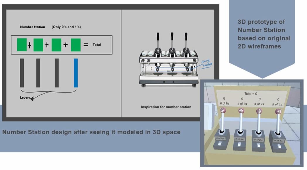 HERE is the current apk file of the high fidelity prototype of the binary math level of CSpresso. You have to sideload it onto the Quest, and use your thumb controller to move the stations closer to you if you are not in a 20’ x 20’ playable area.